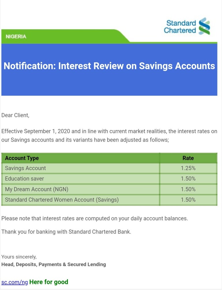 “Effective September 1, 2020 and in line with current market realities, the interest rates on our Savings accounts and its variants have been adjusted,” Standard Chartered Bank told its customers in a September 3 email.