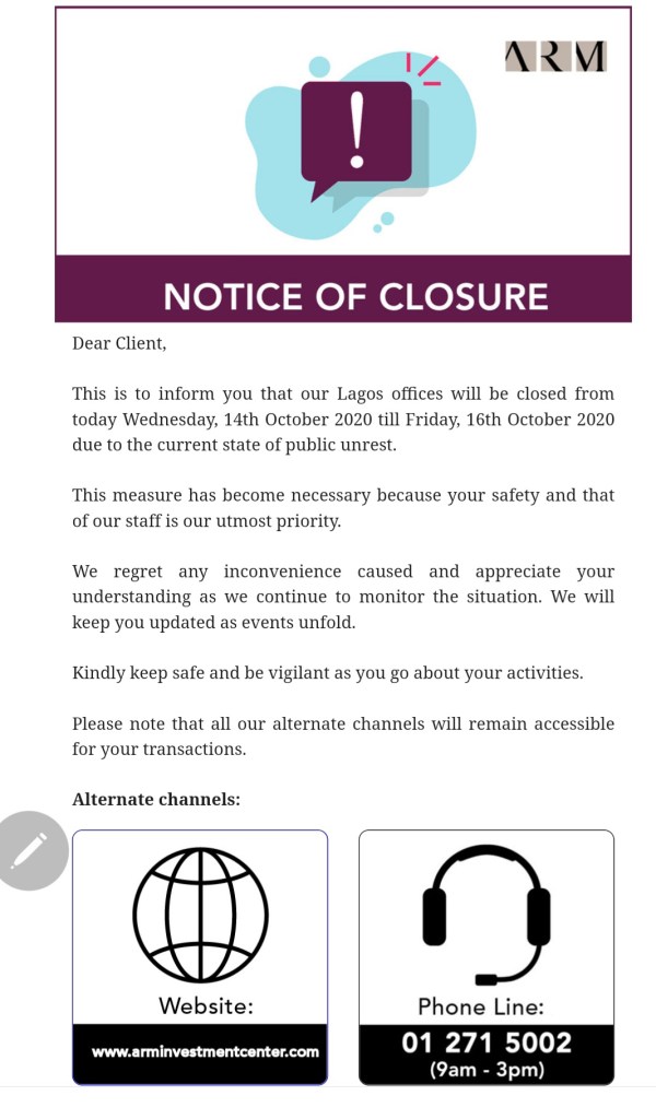 Wealth management firm ARM sent out a note to its customers on Wednesday announcing the closing of its offices for the rest of the week, citing the present state of unrest.